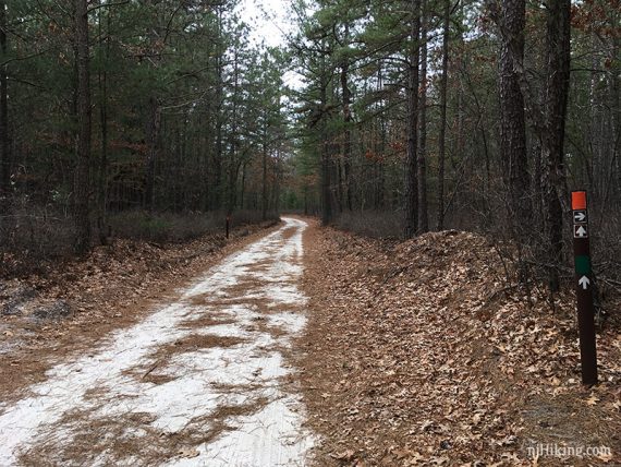 Now at the wide sand road, turn LEFT to follow ORANGE (CCC)/GREEN (Nisky).