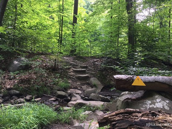 1.0 – Cross a stream on rocks and start following YELLOW (Stuart Witherspoon). [YELLOW also goes to the left towards Great Road and Woodfield Reservation].