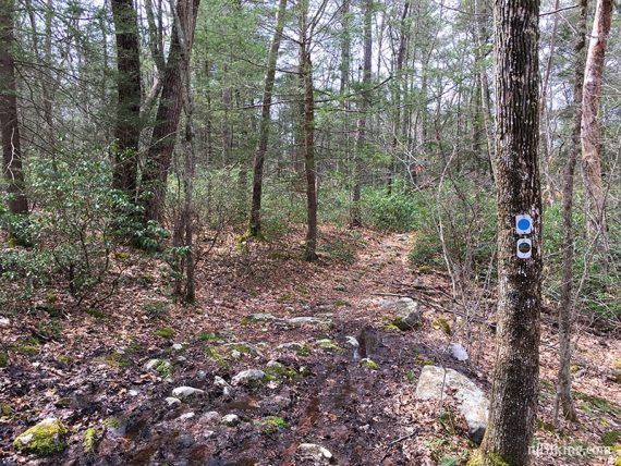 2.9 – Start following Stony Brook (BROWN). Don’t go over the bridge. [Blue Mountain Loop (BLUE) leaves to the right, over the bridge].